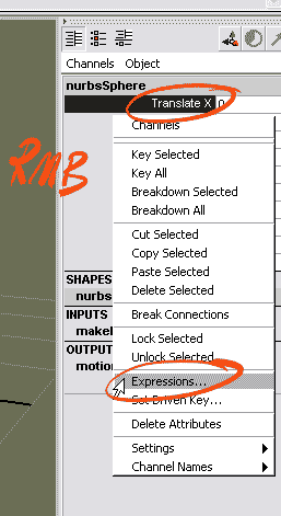 In our example we'll animate a simple nurbs sphere with an expression. In the sphere's Channel Box mark the Translate X channel and click and hold the right mouse button. This opens the context menu where you find your way to the Expressions. |