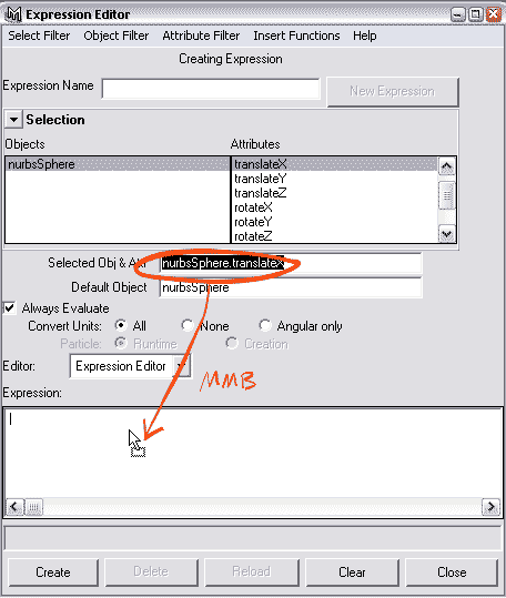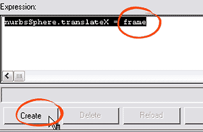 All you need to type now is = frame The equation tells Maya to move the sphere to the right: At frame 0 it's sitting in the origin. At frame 25 (which is one second in PAL) it's wandered 25 units to the right. Click the Create button to activate the expression. |