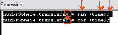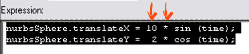 This was your first expression in Maya. You want a second one? Well, reopen the Expression Editor via the Channel Box and change the equation. For example you might want to do a real math thing and use the sine and cosine functions? The first line in the expression below tells the sphere to swing endlessly to the right and to the left. The second expression tells it to swing up and down. Using "time" instead of "frame" slows the animation down. "time" counts in seconds. Don't forget to end each line with a semicolon. |
