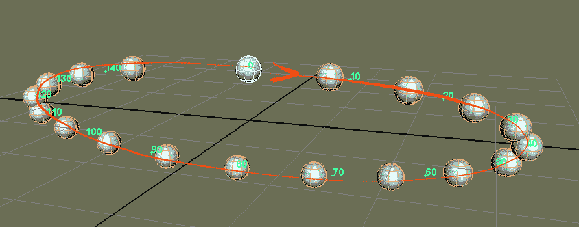 Klicken Sie am unteren Rand des Expression Editors den Edit-Knopf und spielen Sie die Animation ab: Die Kugel kreist nun um den Ursprung. Wenn Sie Lust haben, multiplizieren Sie den Sinus um 10 und den Kosiuns um 2. |