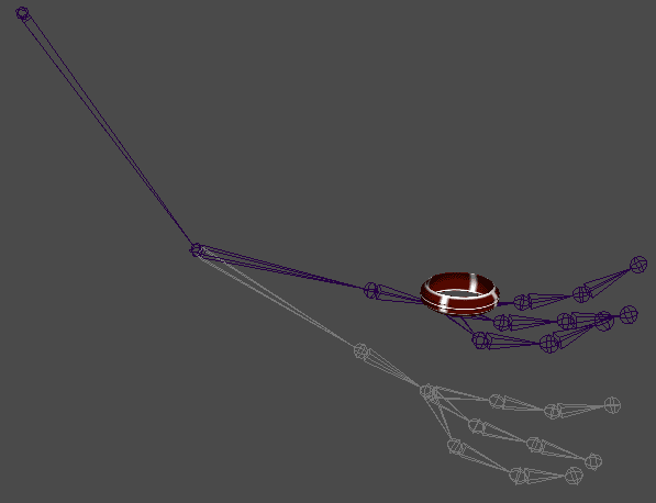 The Point Constraint clamps the ring to the palm of the hand. The command is simple. In Animation mode (F2) first select the palm joint of the hand followed by the ring and choose Constrain > Point. The ring snaps to the joint and stays there whereever you rotate (or move) the hand or the arm. |