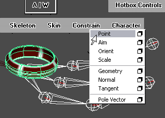In the illustration above you see the point constraint in action. While the ring follows the hand, the ring doesn't rotate accordingly. It stays horizontal all the time. The Point Constraint doesn't care about direction, only about position. Here the Aim Constraint enters the scene: It makes the ring aim to a certain joint all the time. In the illustration below that joint is the root of the hand, not the palm of the hand. |