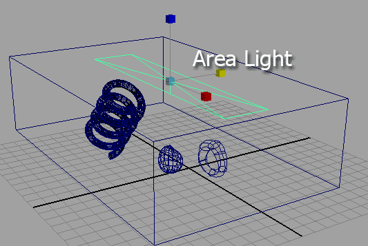 The image above took 5 seconds to render on my rather old pre-dual core 2 GHz machine. The rendering shows all textures but the lighting looks indifferent. You couldn't tell where the light actually comes from. It casts no shadows, only some self-shadowing effects give the impression of 3D objects. In other software packages like Cinema 4D the first rendering of such a simple scene looks much better because it uses different algorithms. Maya usually starts with a depressing image. Or do you find it inviting? First thing in order to improve the look is some controllable light. I'll go for an area light shedding its energy from the very top of the cube onto the three objects inside like in the illustration below: |