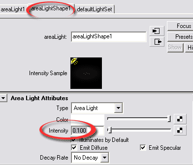 The image is over exposed. This has to do with an odd behaviour of the area light. Let's go to the attribute editor of the light and lower its intensity: |