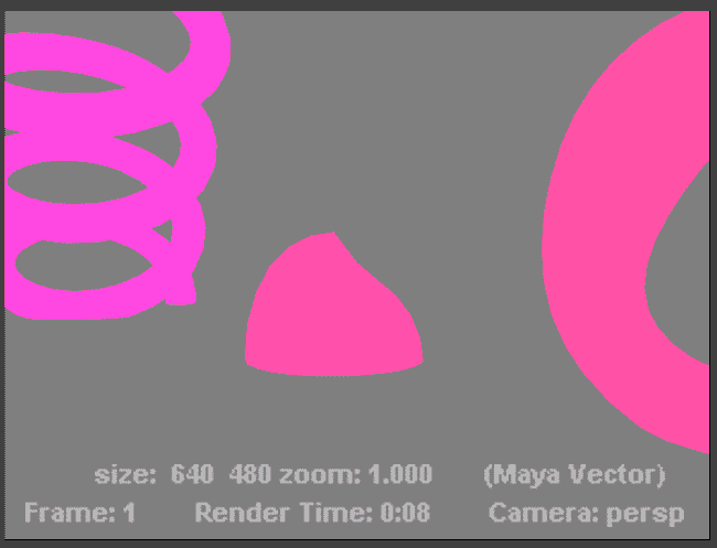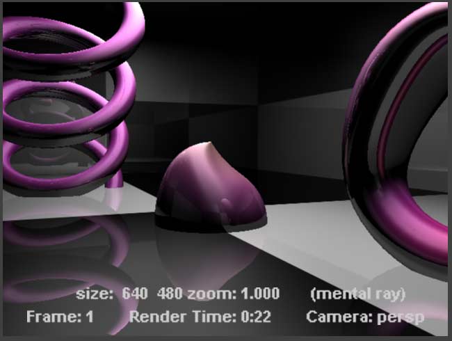 It took much longer to render, and the reason for this is that Mental Ray by default produces reflections for reflective materials. This special rendering technique is called "Raytracing". Maya can render these reflections as well but needs two special clicks which you find described in this raytracing tutorial. Quite contrary to the reflections in raytracing is Maya's Vector rendering option. It gives you an image like the one below by default. With a few extra clicks it can look much cooler, but this would lead us too far off: |