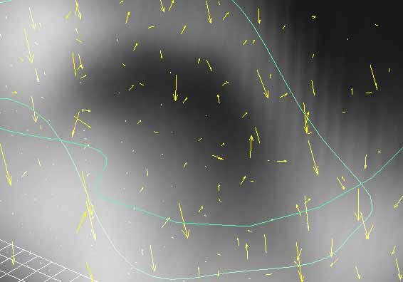 A close-up view of the motion vectors around the curve | Nahaufnahme der Bewegungsvektoren um die Kurve herum