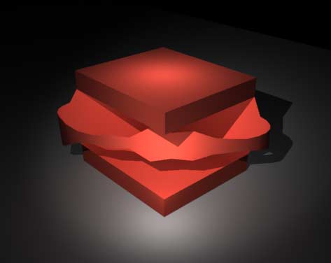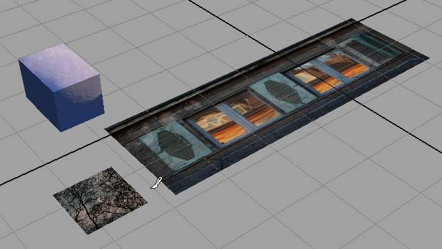 Bisher musste man sich bei den Artisan-Malwerkzeugen entscheiden, auf welche Fläche man z.B. malen wollte. Mit Maya 8 wird das Malen von Attributen (also nicht nur Farbe) über mehrere Flächen möglich. Die drei Objekte in der Abbildung (zwei NURBS-Flächen, ein Polygonquader) tragen unterschiedliche Texturen. Mit dem "3D Paint Tool" male ich mit einem einzigen (grünen) Strich über sie alle hinweg: |