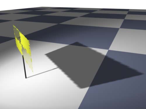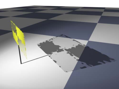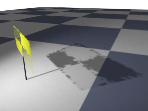 | Deep Shadows are a feature of Renderman which can handle motion blurred shadows as well as other things. This experiment shows Renderman's way to deal with a semi transparent object's shadow. | "Deep Shadows" haben in Renderman u.a. die Fähigkeit, die Schatten bewegter Objekte richtig zu rendern. Dieses Experiment zeigt, wie Renderman mit dem Schatten eines halbtransparten Objekts umgeht. |