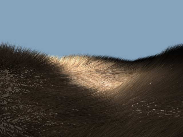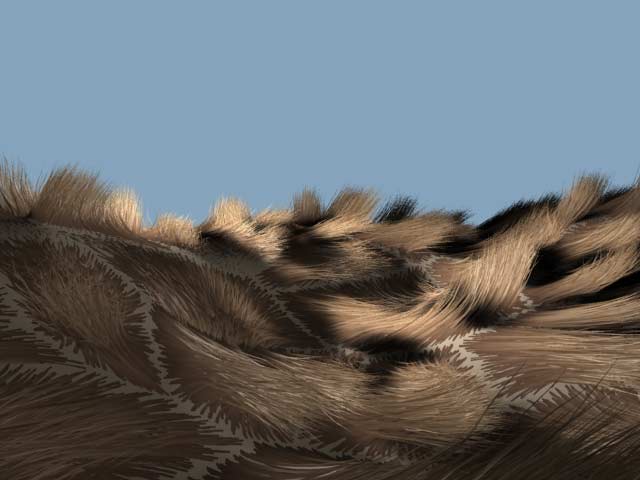 | Actually, Renderman does an equally fine job here interpreting Paint Effects strokes as I already experienced in the paintFX log. Now, to Fur. Maya (to be precise: Maya's Fur render application) renders this scene with the same light setting as above in 17 seconds. This is the draft default and could be improved a lot. Never the less is the result impressive: | Renderman erledigt den Job, Hair zu rendern ähnlich gut wie das Rendern anderer Paint Effects. Siehe dazu meine Renderman & paintFX-Experimente. So, jetzt zu den Fellen. Die Szene hat die gleiche Beleuchtung wie oben, und Maya (um genau zu sein: Mayas eigenständige, aber nicht als solche wahrnehmbare Software zum Rendern von Fell) rendert diese Haarpracht in 17 Sekunden - ein beeindruckendes Bild, und das, obwohl die Render-Einstellungen denkbar niedrig sind (Draft = Entwurf): |