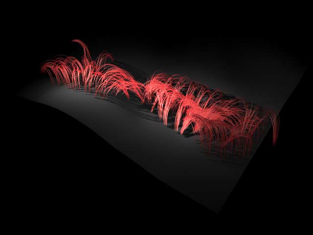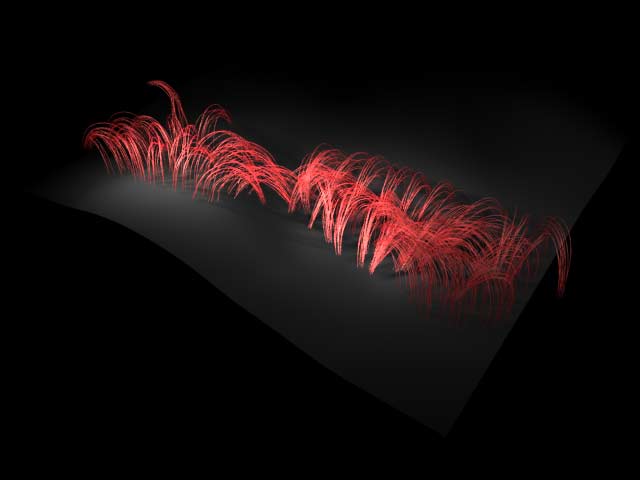 | This experiment concludes my Renderman for Maya logbook. For feedback, please use my contact page. Hair and Fur are two totally different things in Maya. Hair is based on Maya's Paint Effects. No wonder Renderman takes much longer to render hair than Maya does. Fur is an old speciality of Maya Unlimited. The image below shows a scene which took Maya Software 6 seconds to render. | Dieses Experiment beschließt mein Renderman-für-Maya-Logbuch. Wenn Sie mir schreiben wollen, nutzen Sie bitte meine Kontakt-Seite. Haare und Felle sind zwei völlig verschiedene Dinge in Maya. Hair basiert auf den Paint Effects und wird deshalb von Mayas Software natürlicher Weise deutlich schneller gerendert. Die Felle sind ein altes Modul von Maya Unlimited. Das nachfolgende Bild zeigt eine Szene mit einigen Haaren, die Maya Software in 6 Sekunden rendert. |