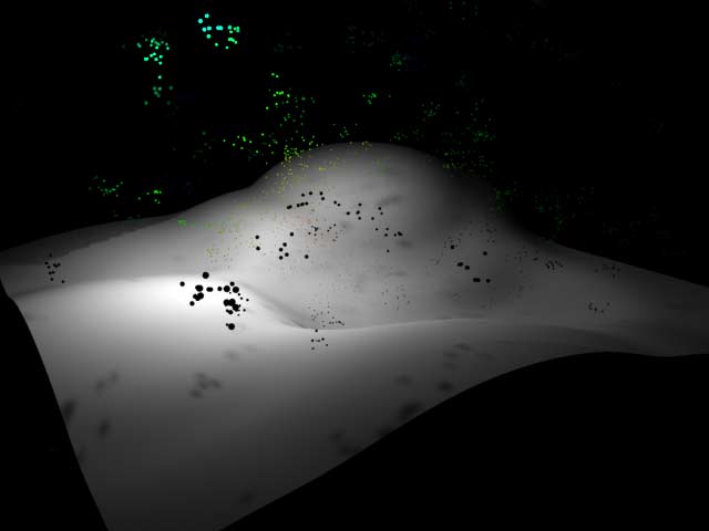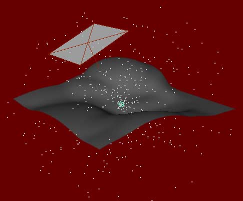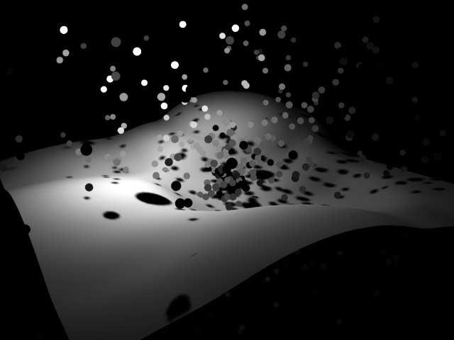 | Standard particles representing points like in this scene require Maya's Hardware Renderer or the Render Buffer. When you render the scene using Maya Software you get this: | Standardpartikel, wie die Punkte in dieser Szene, können nur mit Maya's Hardware Renderer oder dem Render Buffer sichtbar gemacht werden. Maya's Software Renderer macht das aus der Szene: |