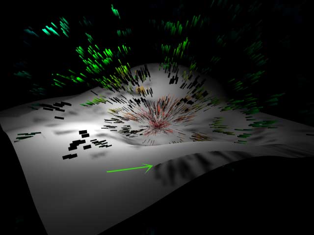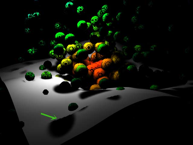 | Another example: Multistreaks. For a reason I don't know Renderman renders a faulty shadow area in the lower part of the NURBS-plane (green arrow): | Ein weiteres Beispiel: Multistreak-Partikel. Seltsamer Weise rendert Renderman hier einen Fehler im Schatten (grüner Pfeil): |