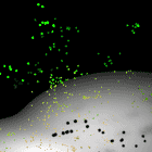 | The next step to improve this scene is using motion blur in combination with Renderman's high quality "Deep Shadows". You see not only the particles but also their shadows motion blurred: | Der nächste Schritt, um diese Szene aufzuwerten, ist das Einführen von Bewegungsunschärfe mit Renderman's Deep Shadows. Sie sehen, dass nicht nur die Partikel verwischt erscheinen, sondern auch die Schatten: |