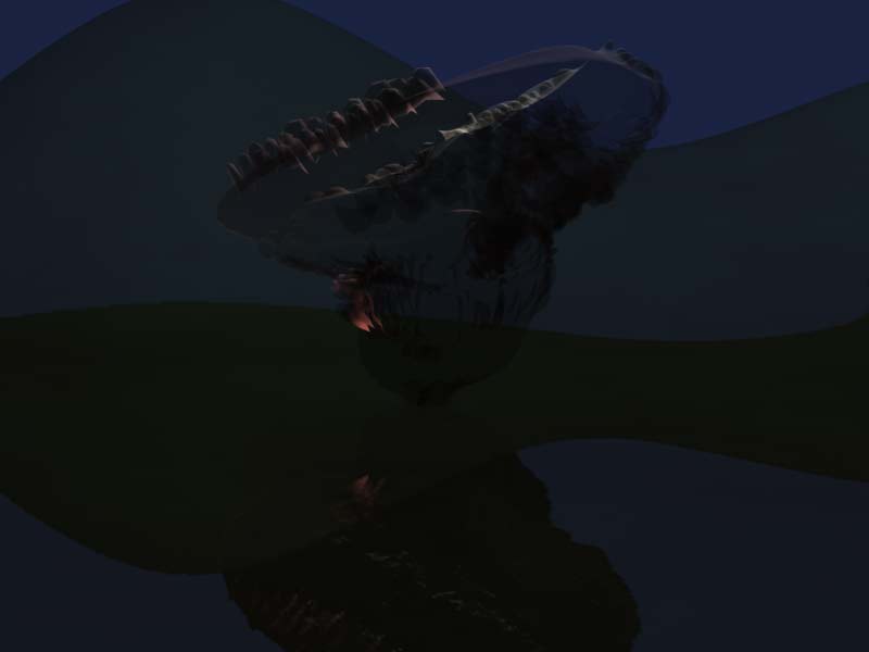| It took Renderman about 4 minutes to render this image with Raytracing (Reflection) and all. It renders a diffuse pass first and the rest, including Subsurface Scattering afterwards. The Subsurf-pass can be "baked" and reused. This makes sense when you don't change the light in the scene. And don't be mistaken: Subsurface Scattering is neither a glow effect nore a refraction or transparency effect. In order to see the difference I rendered the object without Subsurface Scattering and with a high degree of transparency: | Renderman hat incl. Raytracing (Reflektion im Boden) etwa 4 Minuten für dieses Bild gebraucht. Zunächst wird der Streulicht-Layer gerendert, anschließemd der Rest. Man kann den Subsurface-Durchgang als File abspeichern und beim nächsten Rendern wiederverwenden. Das macht Sinn, wenn sich die Kamera bewegt, das Licht aber gleich bleibt. Missverständnisse zu vermeiden: Subsurface Scattering ist kein Glüh-Effekt, auch kein Effekt der Lichtbrechung oder der Transparenz. Um letzteres zu demonstrieren (auch mir selbst), habe ich das Bild ohne Subsurface Scattering noch einmal gerendert und das Polygonobjekt stark transparent gesetzt: |
