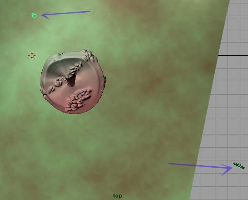 | The scene consists of a pretty complex polygon object, placed on a simple reflective ground plane. An ambient light with miniature intensity spills minimal light all over. a strong spot light (top arrow) lights the object from behind. In this top view the camera icon appears on the right. |  | Die Szene von oben: Sie sehen ein ziemlich komplexes Polygonobjekt auf einer einfachen, Licht reflektierenden Fläche. Ein Umgebungslicht mit sehr niedriger Intensität beleuchtet die gesamte Szene minimalst. Das Spotlight (hier oben links mit Pfeil gekennzeichnet) beleuchtet das Objekt von hinten und mit hoher Intensität. Die Kamera ist in dieser Ansicht rechts unten zu sehen. |