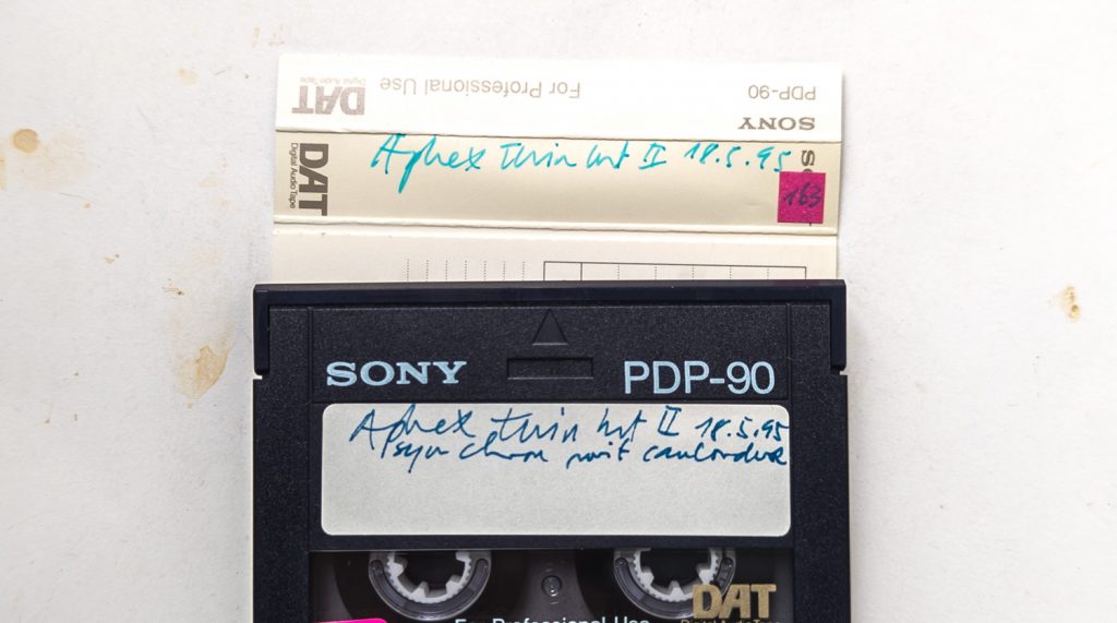 i met richard d. james a.k.a. aphex twin twice. the first interview, in 1994, was lost. it was the only tape i ever lost. richard was in a strange mood, like on a drug. suprisingly, when we met again in may 1995, he remembered details of our interview a year earlier. the 1995 interview took 45 minutes. an 8 minute extract can be found → here and in the → wikipedia. richard was 23 years old and quite famous. we talked about sequencers, synthesizers, midi, DJing, clubbing, and the music label contract. i quite enjoyed the conversation. and i’m glad i found this DAT tape today.