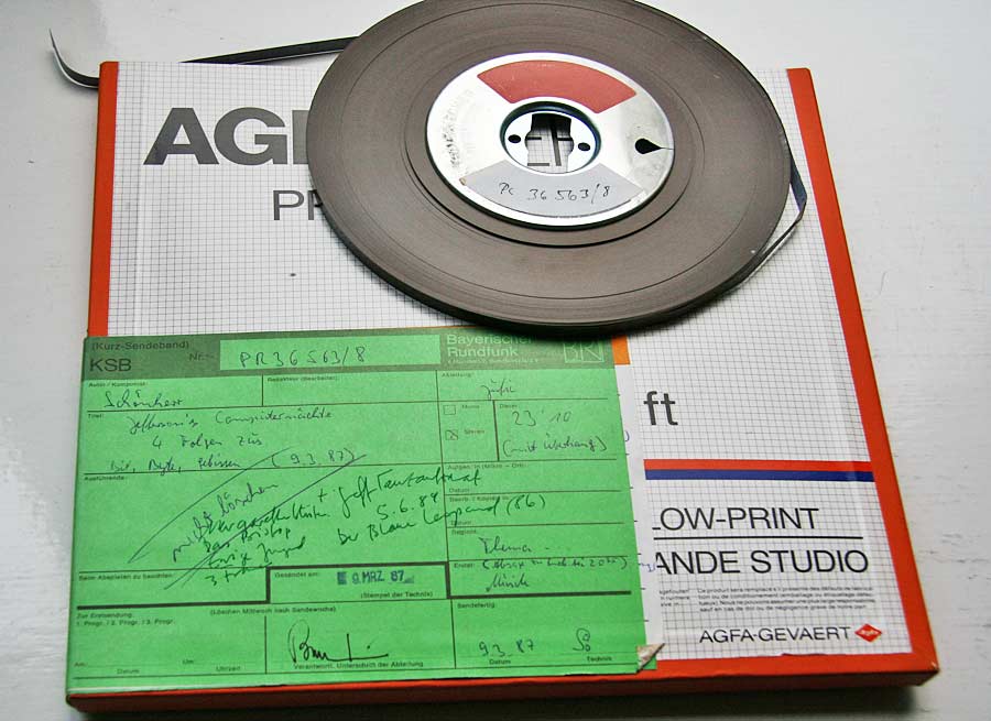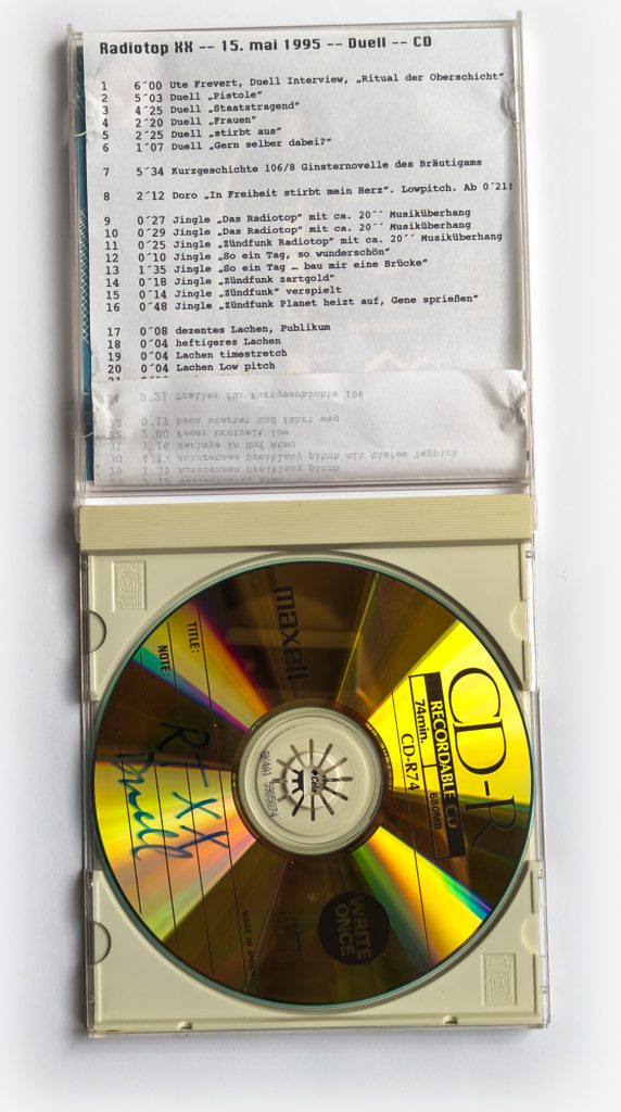 ich habe für das → zündfunk radiotop 1993 einen digitalen weg eingeschlagen und für meine sendung die tonband-zuspielungen abgeschafft. das war eine technische revolution und wurde von den kollegInnen der technik mit großem interesse wahrgenommen; die redaktion wusste nichts davon. die technikerInnen mussten nun meine zu hause am computer erstellte audio-CD mit meinem zuspiel-takes abnehmen. ein beispiel davon ist ganz oben zu sehen. die krümmung des aufklebers kommt daher, dass er für die wickelkerne (bobbies) der tonbänder gedacht war. mir als moderator gab die zuspielung von einzelnen takes auf der CD viele freiheiten. ich konnte, ohne diskussion und ohne band-umspulung, schnell die reihenfolge ändern. es war zwar noch eine technikerin hinter der scheibe, aber sie hatte während meiner sendung nichts zu tun.