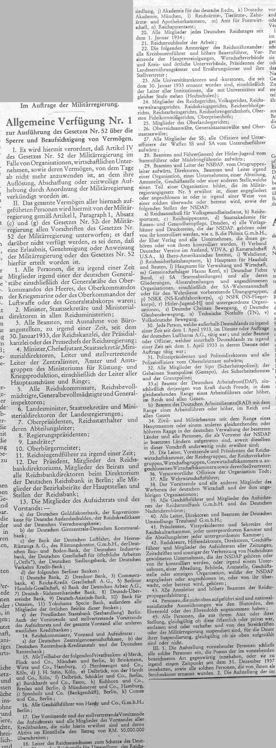 in der zweiten hälfte 1945 hatten die siegermächte die fast vollständige kontrolle über das ehemalige hitler-deutschland. in vielen landkreisen gab es bekanntmachungen wie hier im kreis höxter. bei nichtbefolgen von anordnungen drohten strafen „mit ausnahme der todesstrafe“, wie es hier heißt. im obigen abschnitt sind NS-angehörige sehr detailliert aufgelistet, deren vermögen eingezogen wurde. position 39 übrigens die funktionäre des reichsrundfunks. der zeitungsauschnitt wird durch anklicken schön groß und gut lesbar.