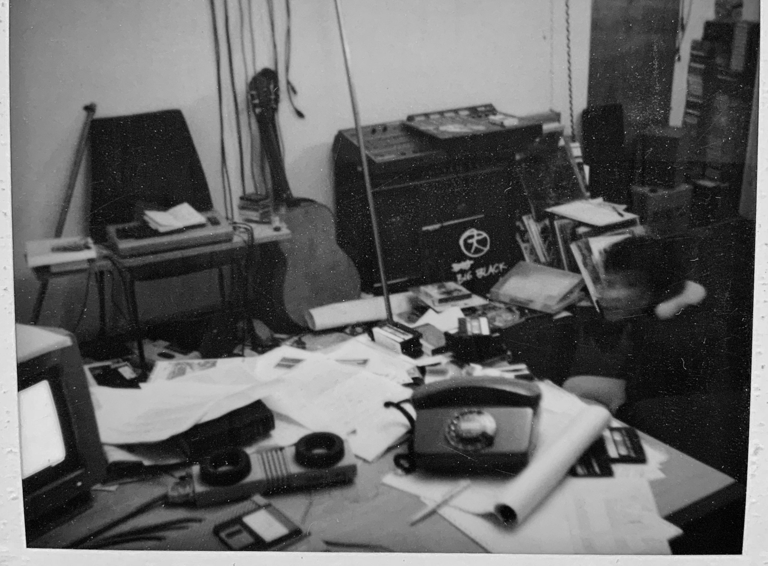 briefly in english:my work space in the mid 1980s. atari ST, acoustic coupler, floppy disks, commodore 64, roland jazz chorus, fostex 260 4track, acoustic guitar.