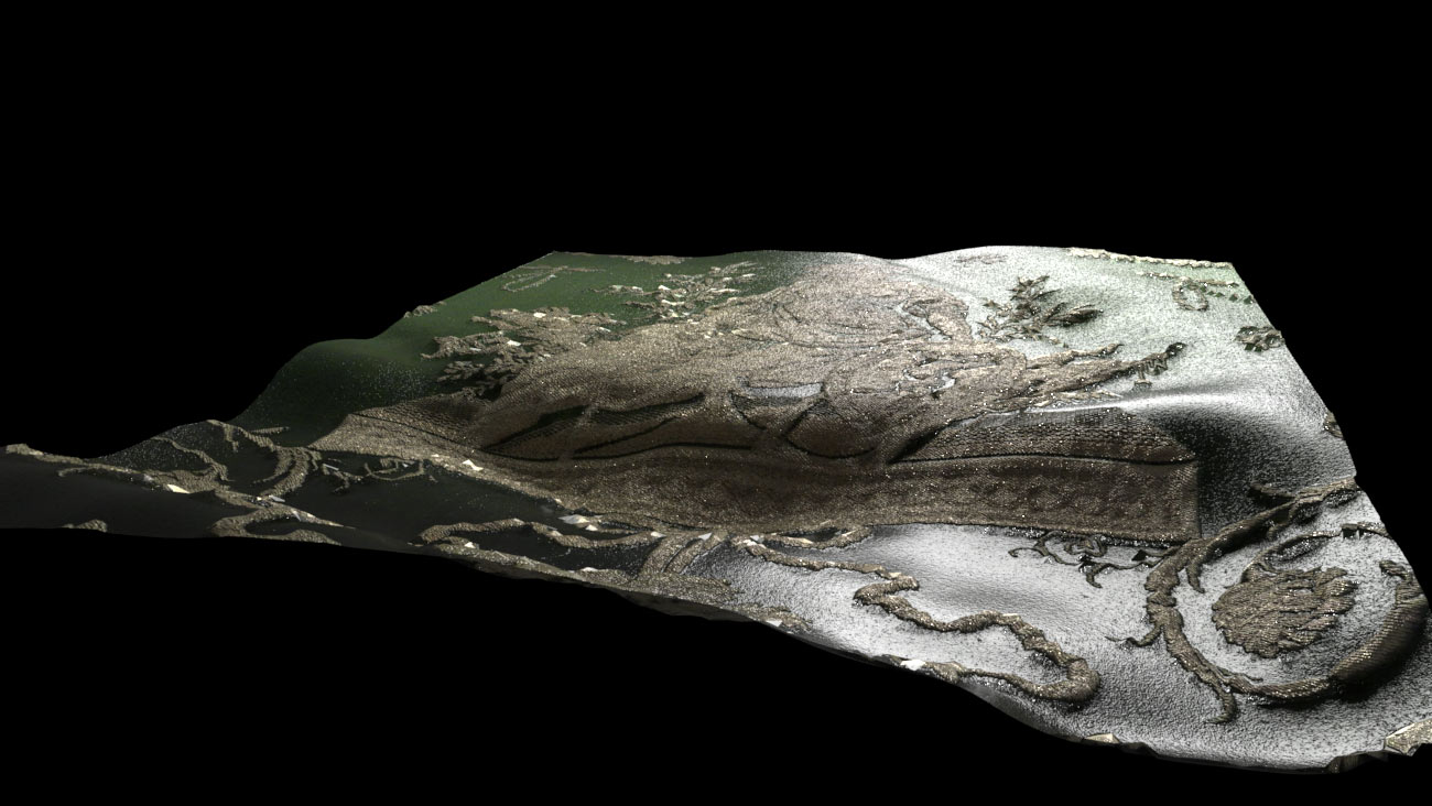 the image above is a photograph taken by a wikipedia author in the royal ontario museum. the textile with its rich brocade ornaments was made in lyon in 1785. i downloaded the image in its highest resolution and fed it into a 3D software. it serves as a texture for the colour, the shinyness and hight mapping of a standard 3D plane.