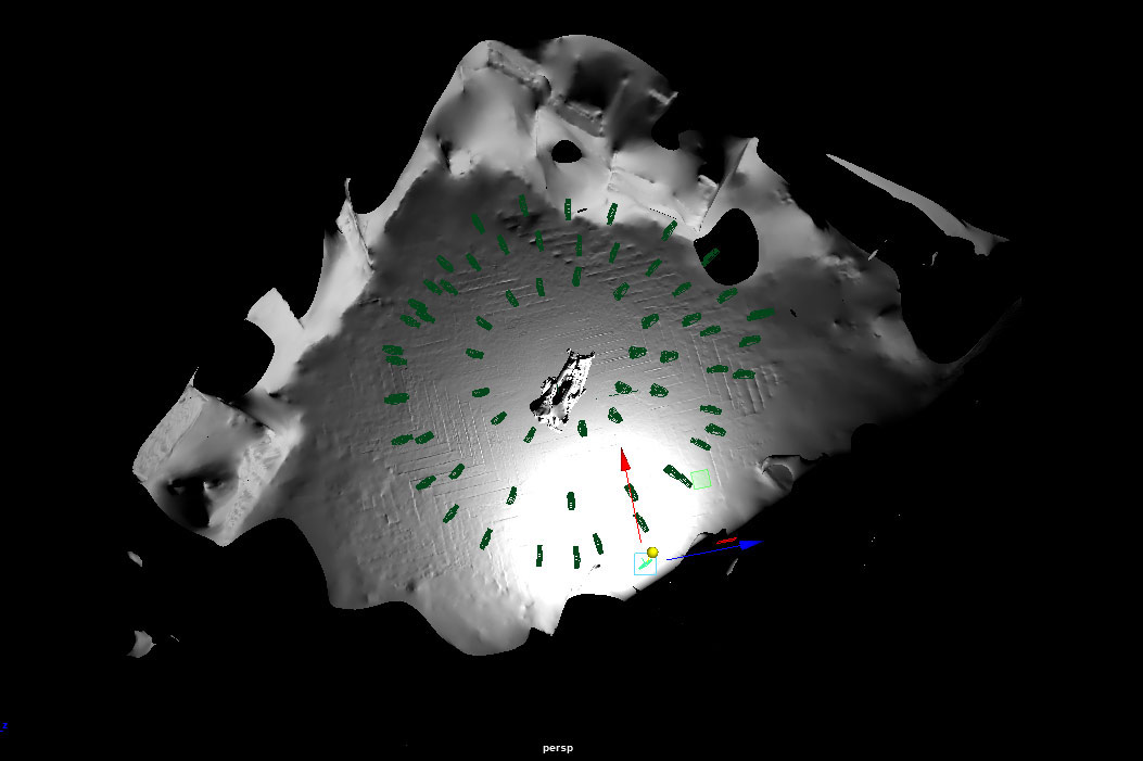 i exported the 3D scene and loaded it into autodesk maya. it arrives with yet another surprise: we see lots of camera icons, 130 in total!