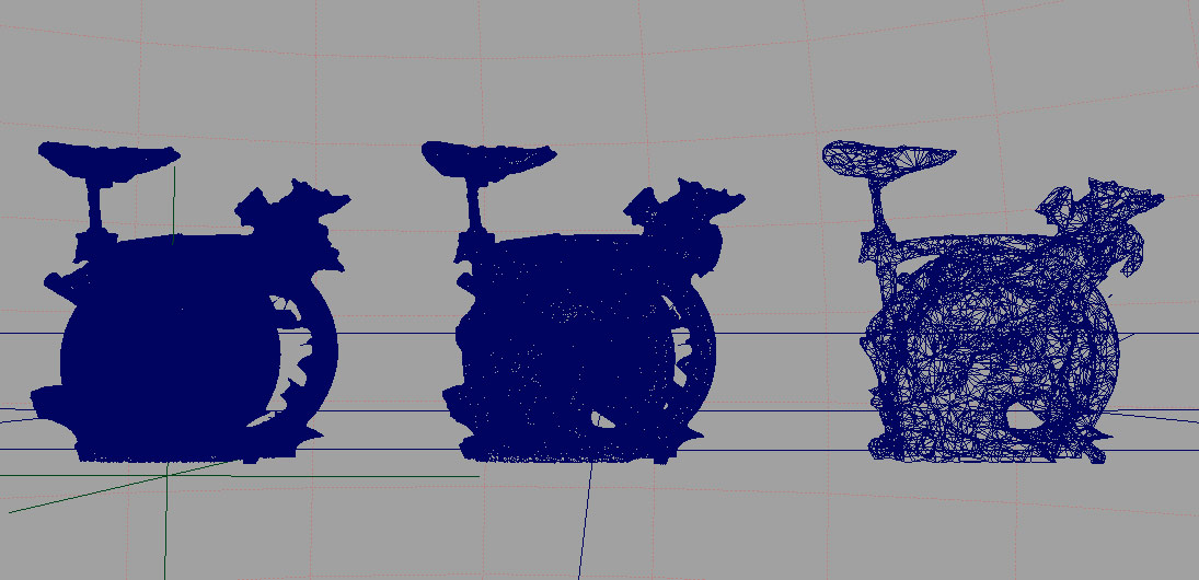 computer animation, especially for gaming, is about mesh reduction. that means you don’t want so many polygons. in the screenshot below you see three bikes which look almost the same. but the left one consists of 700,000 polygons, the middle one of 140,000 and the right one of 9,000 polygon „faces“.
