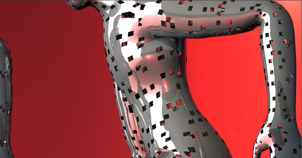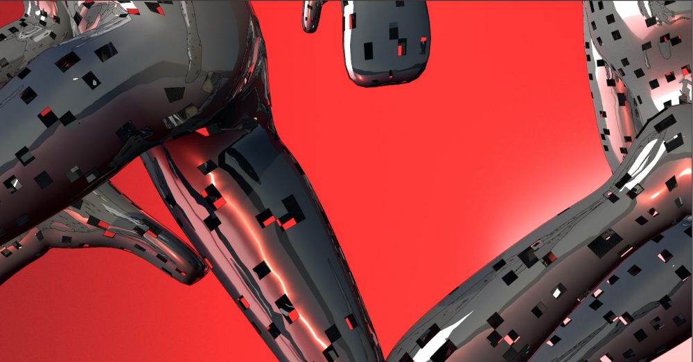 dieses bild ist durch organisierten zufall entstanden. eigentlich basiert es auf einem tutorial, das ich über so genannte partikel-kollisions-ereignisse gemacht hatte. damit ist gemeint, dass ein partikel in der 3D-physik-simulation beim zusammenstoß mit anderen partikeln oder oberflächen bestimmte dinge tut, typischerweise erlischt und neue partikel an dieser stelle produziert. das tutorial ist → hier zu sehen.