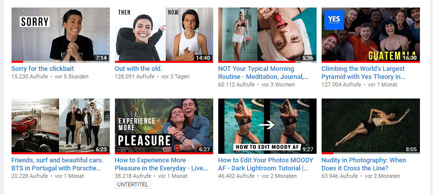 most of her videos are pure talk. she talks at high speed about things like meditation, food, plastic, traveling. the thumbnails of most of her videos show her sparsely dressed, with titles such as „nudity in photography: when does it cross the line?“ a clickbait title & sexy photo, and neglectable content.