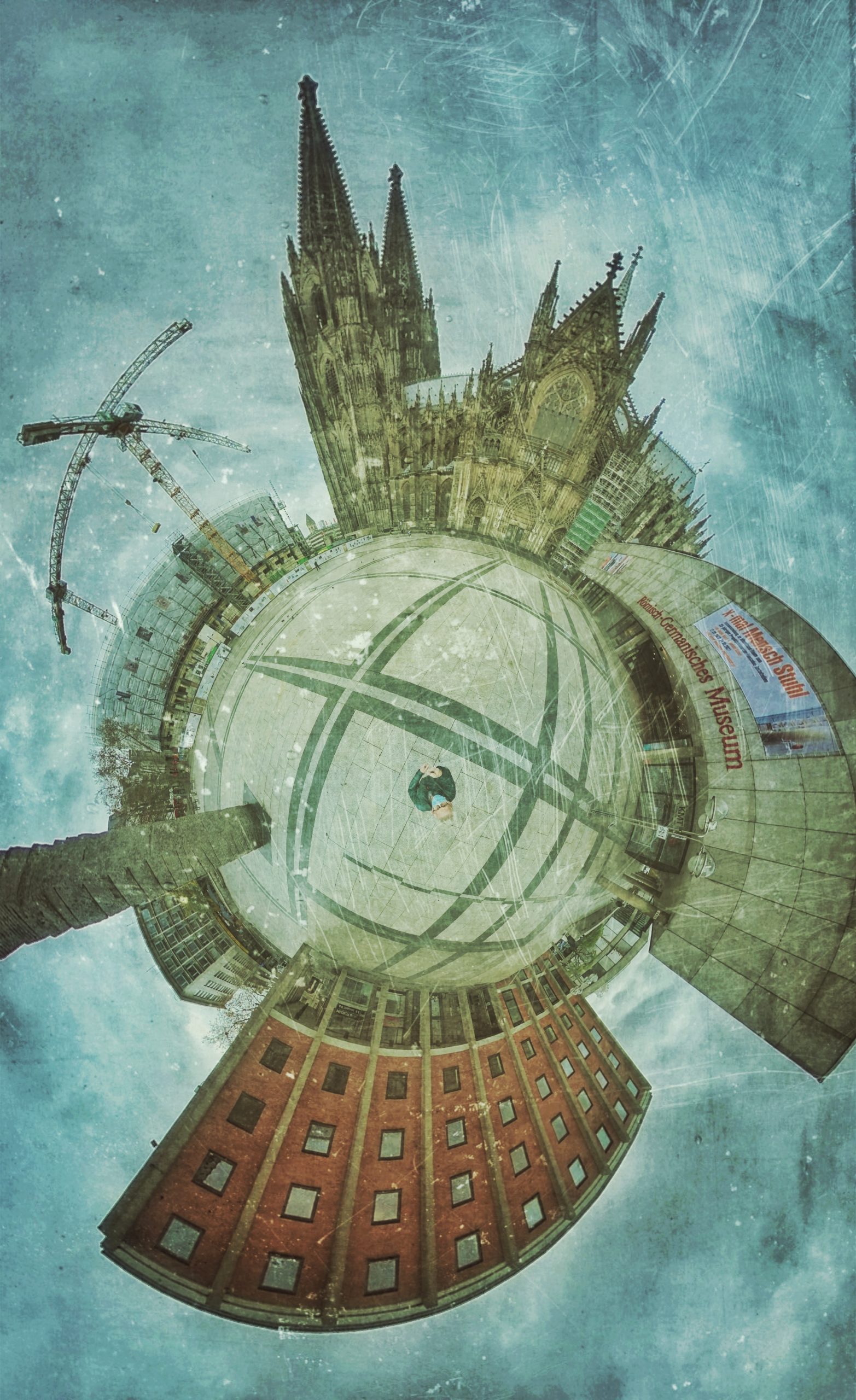 this is my favourite photo of the month. i took it with the new insta360 one x2 next to the cologne cathedral. the city centre looked deserted, due to the corona virus precautions. i held the insta360 selfie stick upwards and called „take a photo“. half a second later the photo was done. i used the insta360 app to create a little planet version of it and finally applied several filters and manipulations with the snapseed app.