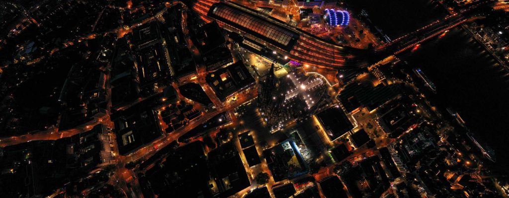 wie oft flog ich mit eurowings oder ryanair von münchen oder london zurück nach köln und sah dabei den rhein und den dom. seit der neuen EU-drohnenverordnung dürfen wir bei bestimmten voraussetzungen nun auch nachts fliegen. so konnte ich mir den dom gestern abend um halb 11 mal genauer von oben ansehen:
