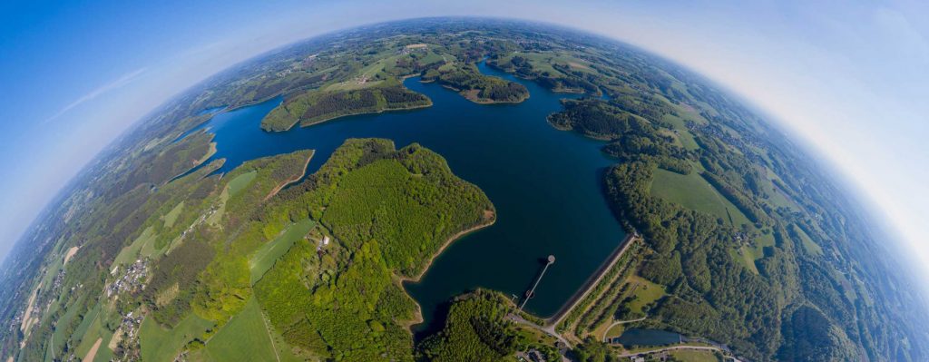 zwar ist hier der horizont einigermaßen gerade, aber die verzerrungen sind auffällig. die staumauer rechts etwa sieht gekrümmt aus, obwohl sie gerade ist. die wälder unten und unten links sind verzerrt usw.