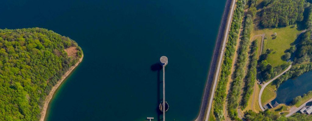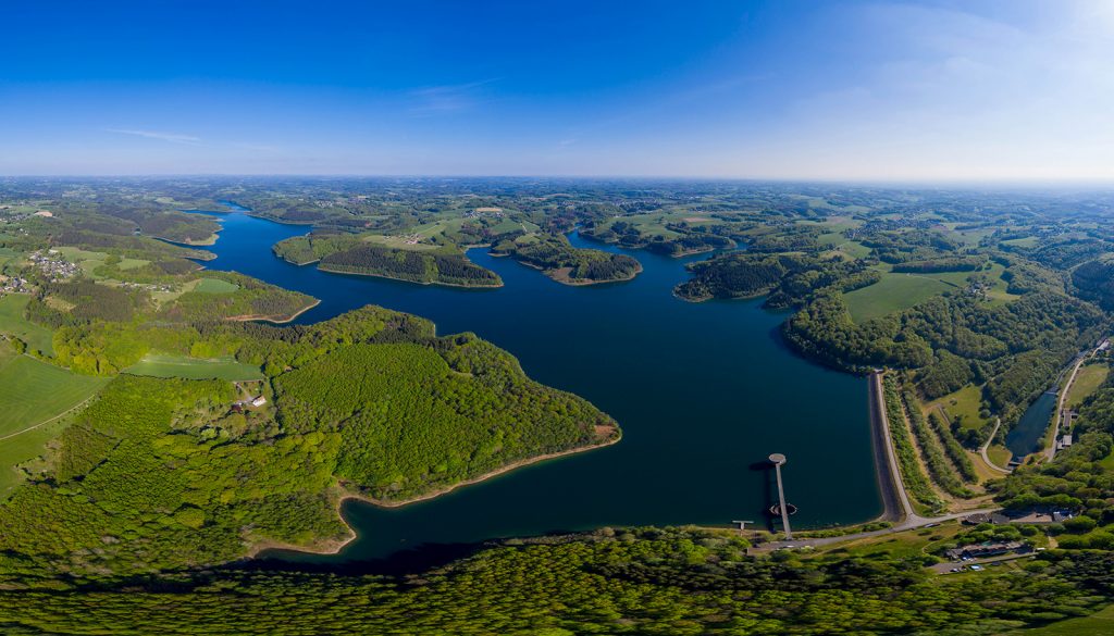 die talsperre ist riesig, und ich musste (natürlich mit genehmigung) sehr hoch fliegen, um sie ganz ins bild zu bekommen. dazu hat die drohne ein rundum-panorama erzeugt, von dem ich den teil platt rendere, der den see in seiner ganzen pracht zeigt.*