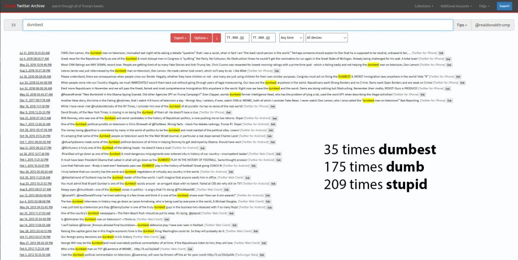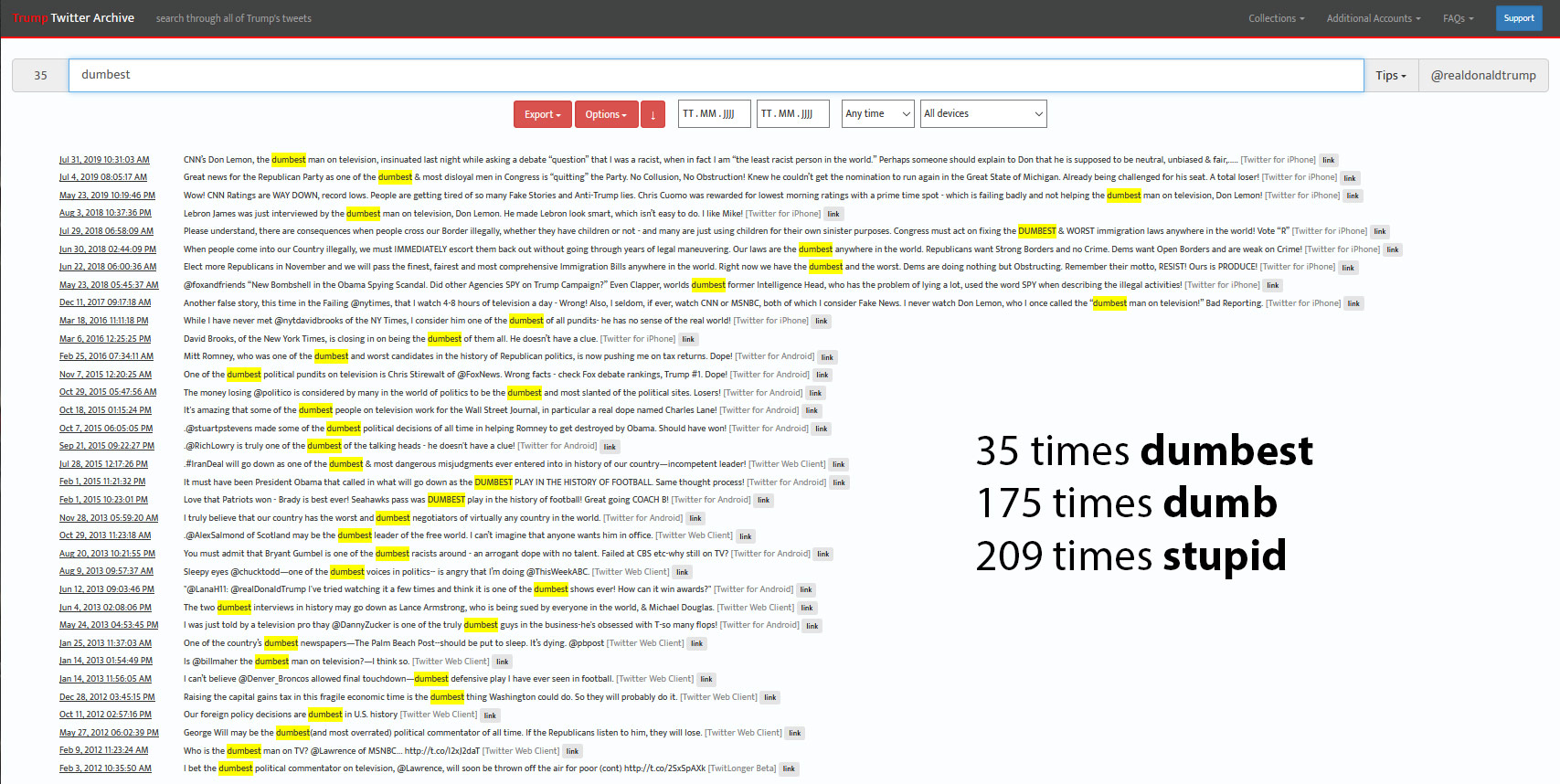 the US president has a pretty limited vocabulary, as we all know. this makes him a common man. the times of intelligent presidents is over. main question: are we, the marginal rest of a decent vocabulary and, yes, decency, are we stupid, dumb or even the dumbest? well, the trump twitter archive runs the statistics.