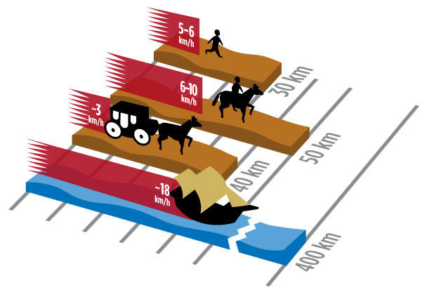 Schematische Darstellung der Fortbewegung um 1800 – und damit auch des Transports von Briefen. Die Kutsche bewegte sich mit 2 km/h wesentlich langsamer voran als der Bote zu Fuß, bei größerer Reichweite (40 km statt 30 km pro Tag). Das Segelschiff wies mit 18 km/h eine nur dreimal höhere Geschwindigkeit als das Pferd auf, aber seine Reichweite betrug durchnittlich ca. 400 km – die des Reiters nur 50 km.