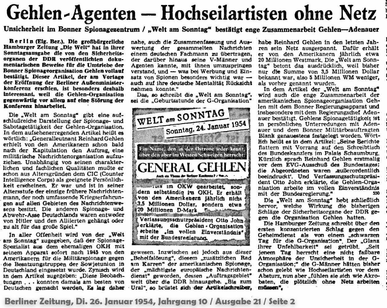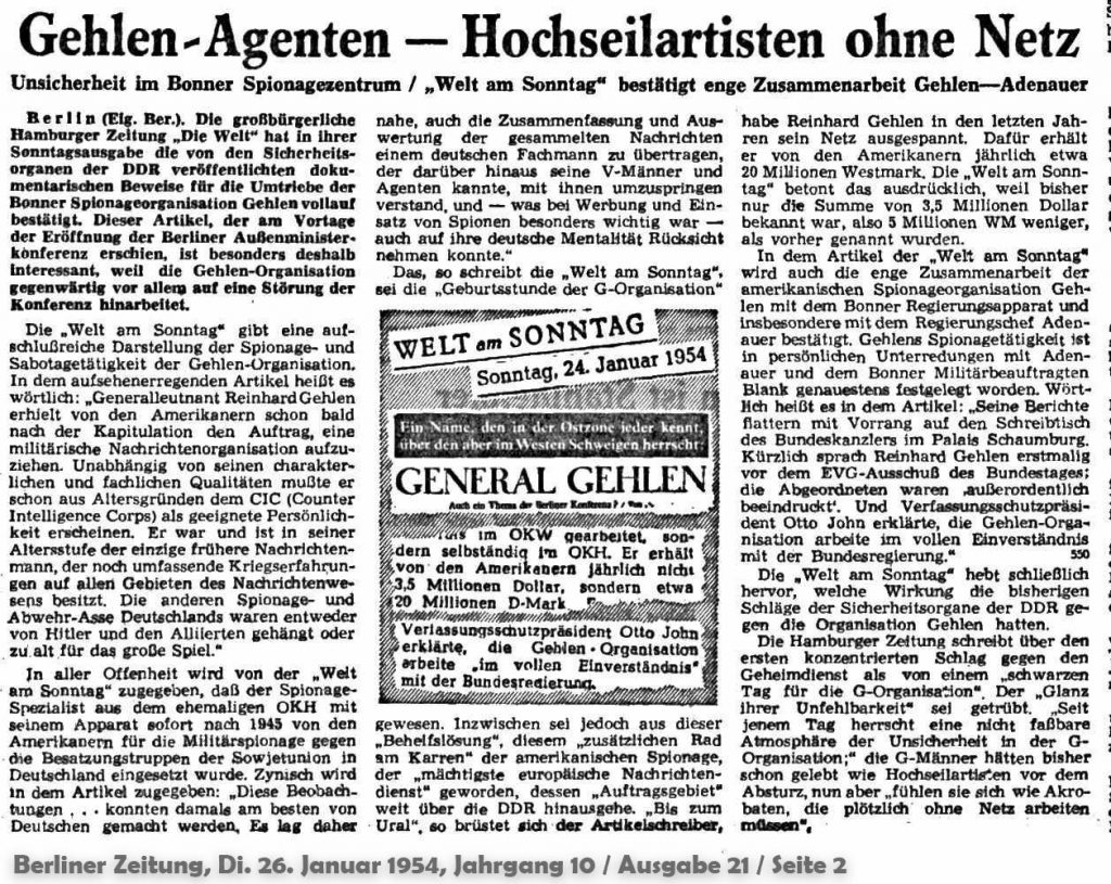 dass gehlen kaum etwas ausrichten konnte, ist eine lange geschichte, die wir u. a. im podcast des stasi-unterlagen-archivs beleuchten. hier seine erste erwähnung in der DDR-presse, im januar 1954.