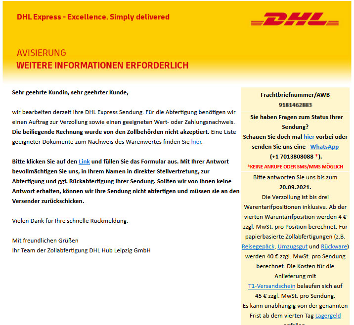 mich rief heute eine frau aus leipzig an, mit nicht unterdrückter nummer, und stellte sich als mitarbeiterin von DHL express vor. es läge eine paketsendung aus china an mich in köln vor, und wegen fehlender zoll-unterlagen würde sie festgehalten. ich dachte an einen → scam, also an einen betrügerischen anruf.