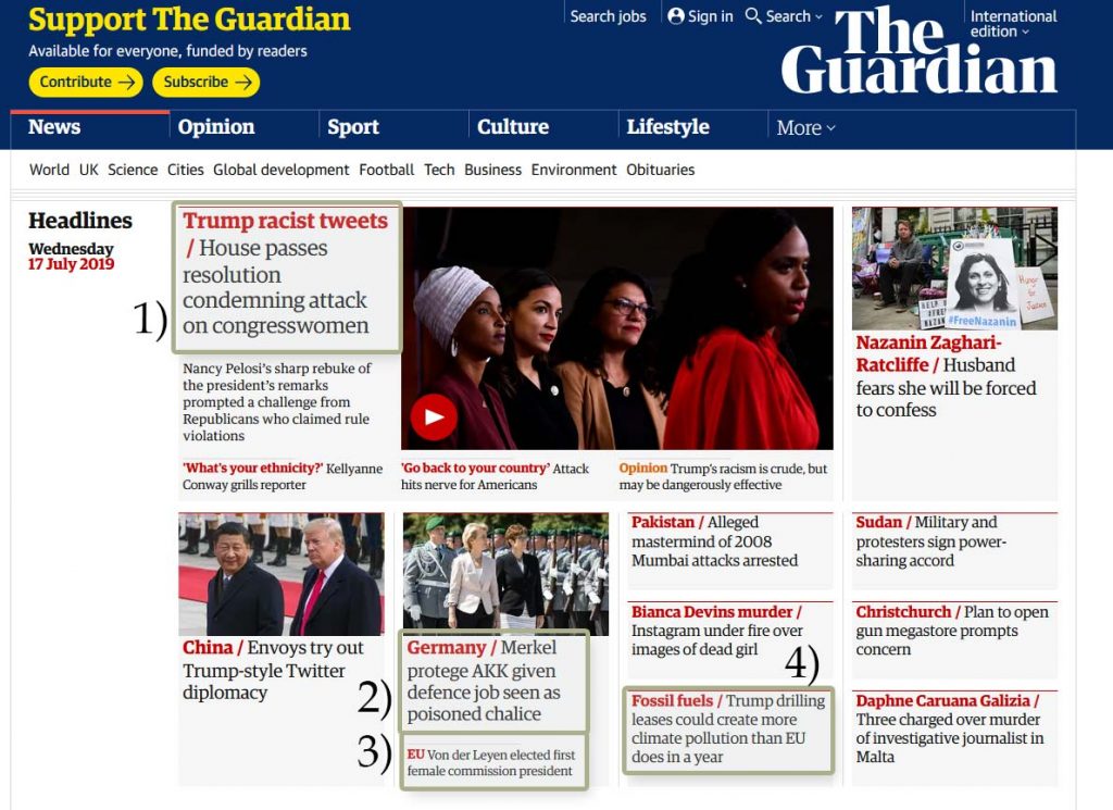 immer gut zu sehen, wie das „befreundete ausland“ dinge sieht. der guardian setzt nach ganz oben (1) die entscheidung des US-kongresses gegen die rassistischen äußerungen des präsidenten. darunter, mittig (2) deutsche innenpolitik, nämlich → annegret kramp-karrenbauer, abgekürzt mit AKK, samt überleitungsfoto, wo sie zusammen mit → ursula von der leyen abgebildet ist. direkt darunter (3) von der leyens wahl zur Eu-kommissionspräsidentin gestern, und rechts davon (4) nochmal der US-präsident und klimawandel.