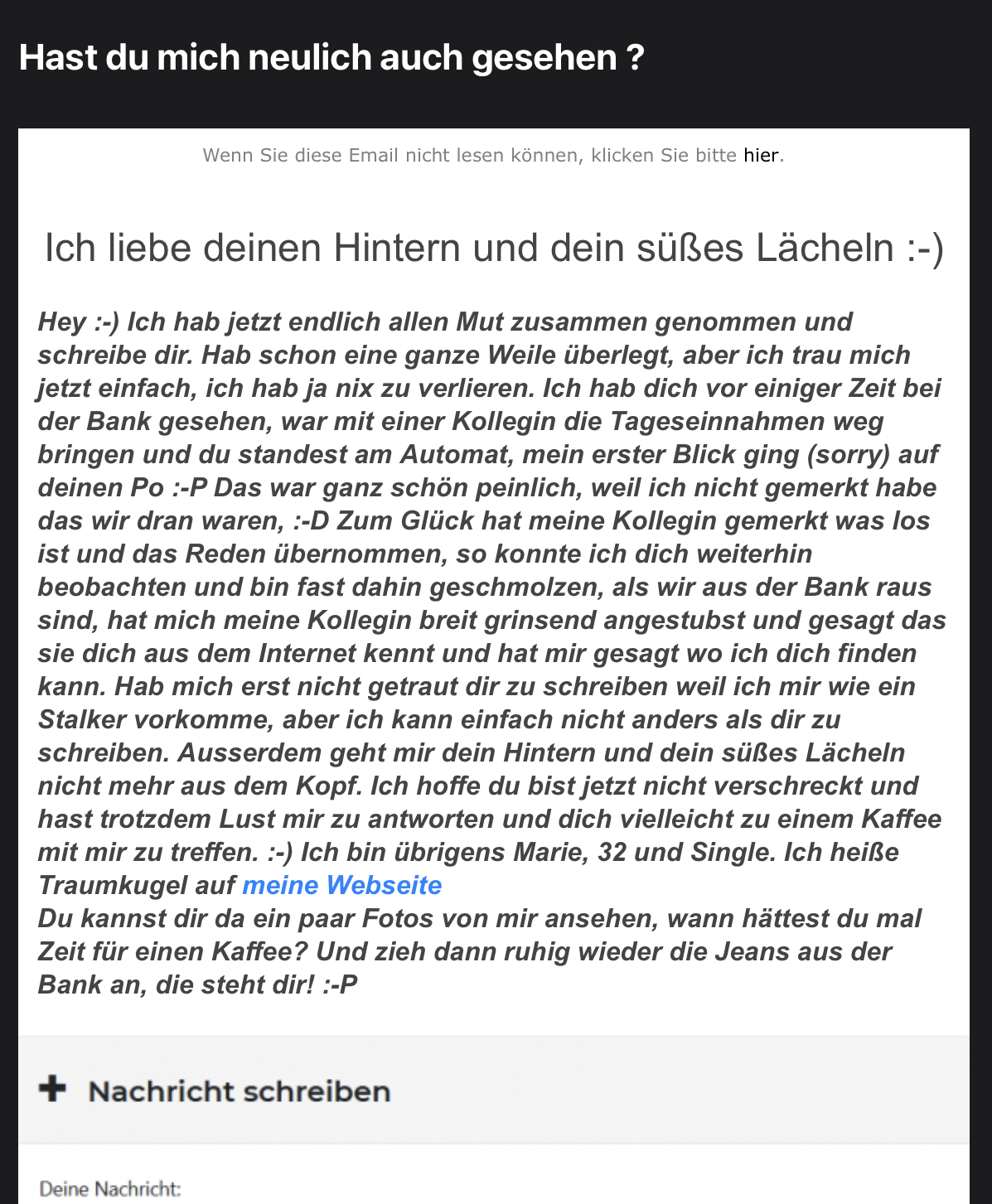 der zweite spam kommt von einer vermeintlichen marie schöne. auch hier wieder ein umlaut in einem perfekt deutschen namen.