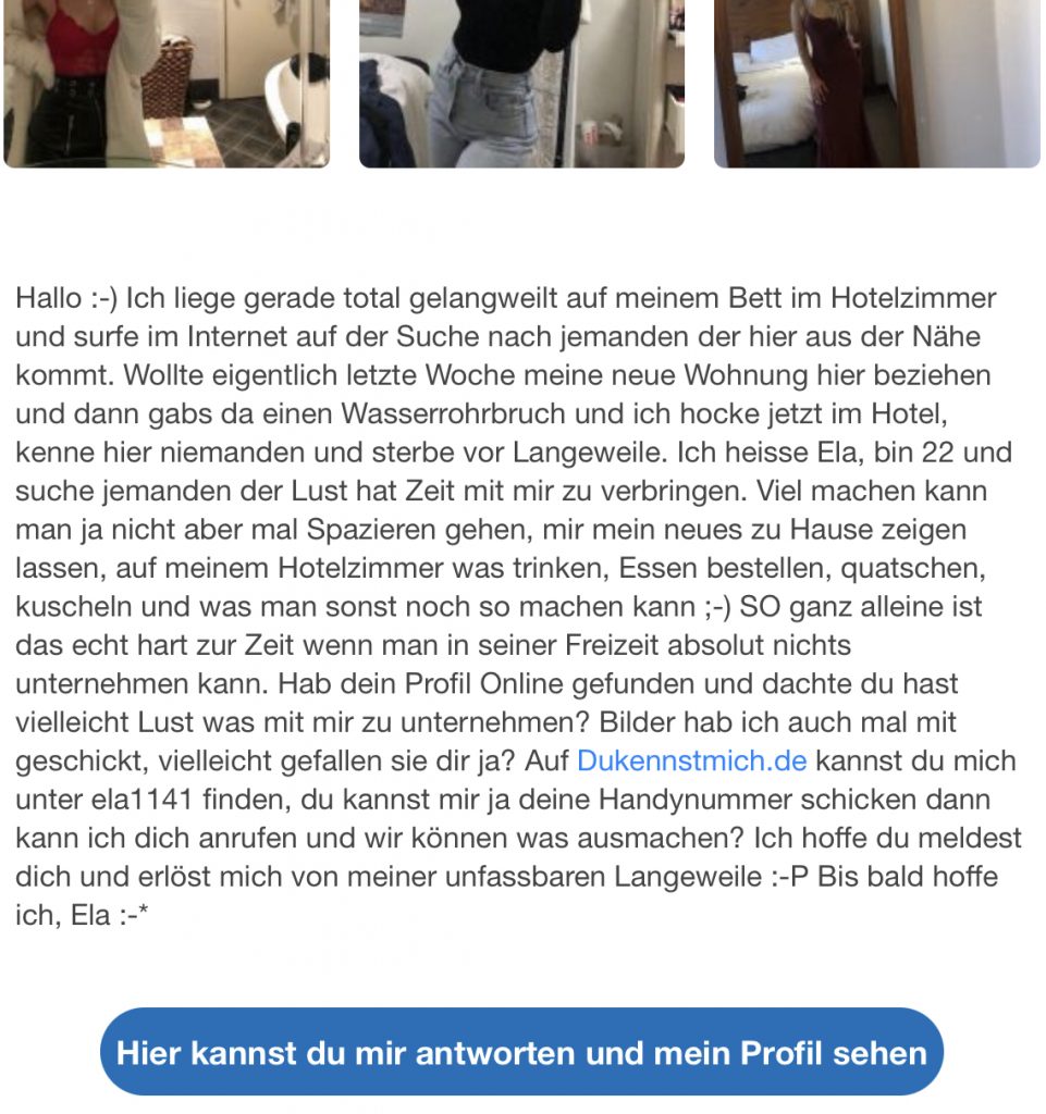 hier führt der link dukenstmich und natürlich die große blaue schaltfläche unten in die falle. die vermeintliche adressatin heißt daniela krüger, ein deutscher name, also vertrauen erweckend für deutsche zielgruppen. im spam-text unterschreibt eine “ela” — nicht ungeschickt.