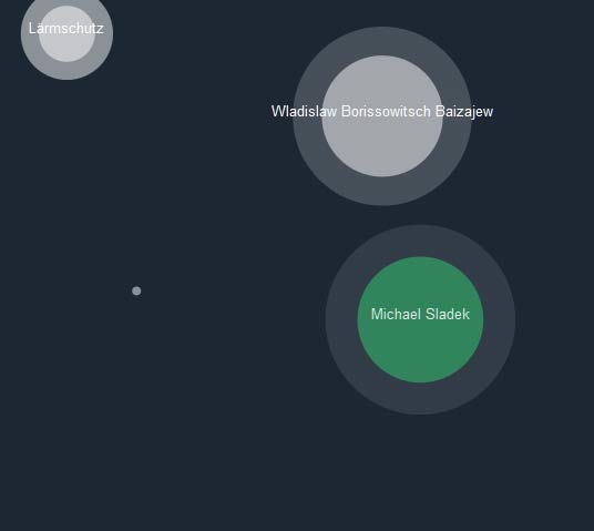 wieder ein feiner tipp von hans. er schrieb mir heutemorgen, ich möge mir doch mal die aktuellen einträge, änderungen, korrekturen in der wikipedia ansehen und anhören. glockentöne bedeuten, dinge kommen hinzu, streicher bedeuten, es wird etwas gelöscht. je größer die kreise, desto mehr. laut screenshot unten wurden innerhalb eines sekundenbruchteils kleinere änderungen in den artikeln über den lärmschutz und (von einem nicht registrierten user, deswegen grün) den arzt michael sladek und eine größere über den russischen ringkämpfer wladislaw borissowitsch baizajew. einfach und anschaulich programmiert von stephen laPorte and mahmoud hashemi gemacht. vorbildlich für eine akustische visualisierung. man höre zum vergleich mal die englische wikipedia oder die wikipedia in farsi.