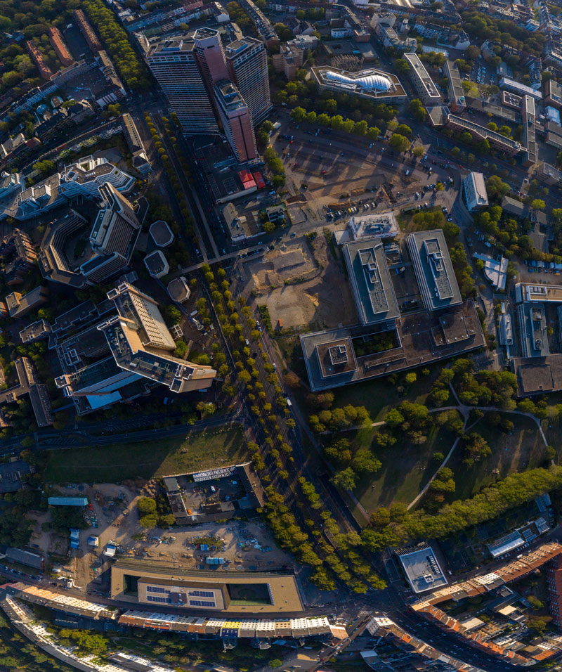 oben im bild ist das unicenter zu sehen, ein dreiflügliches hochhaus. rechts davon das schillergymnasium. das justizzentrum mit dem land- und amtsgericht ist links im bild. unten (wegen der panoramaeigenschaft des bilds etws verzerrt) der neubau des historischen archivs der stadt köln.