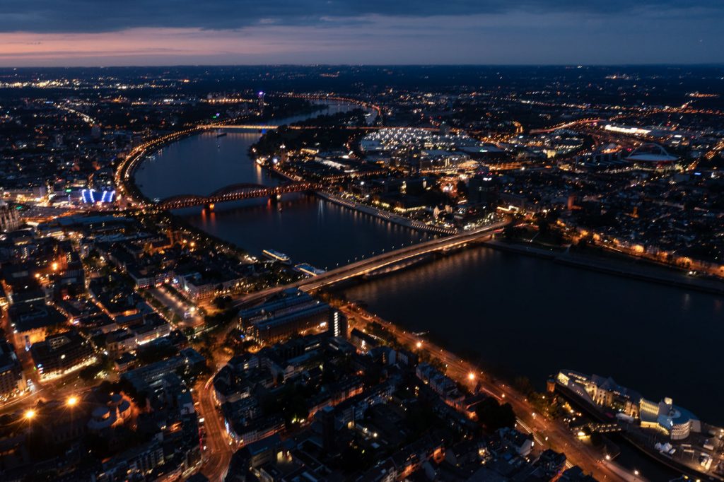 dieses und das nächste foto entstanden bei meinem ersten nachtflug mit der fotodrohne über köln. auslöser ist die anfang 2021 in kraft getretene EU-drohnenverordnung, die mehrere auflagen mit sich bringt, aber eben auch den zuvor nicht erlaubten nachtflug ermöglicht. in diesem fall mit drohnenführerschein A2, ausnahmegenehmigungen der luftfahrtbehörde der NRW landesregierung und absprache mit der deutschen flugsicherung im tower von köln/bonn. letzteres deswegen, weil die am aufstiegsort in der kölner südstadt maximal erlaubte höhe 50 m ist, ich aber durch erfahrung am tag weiß, dass erst 200 meter höhe einen überblick über die stadt ermöglichen. hier war ich 270 meter hoch.