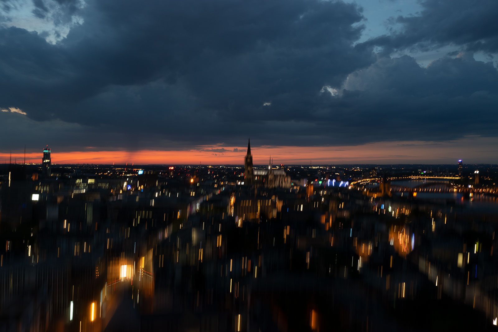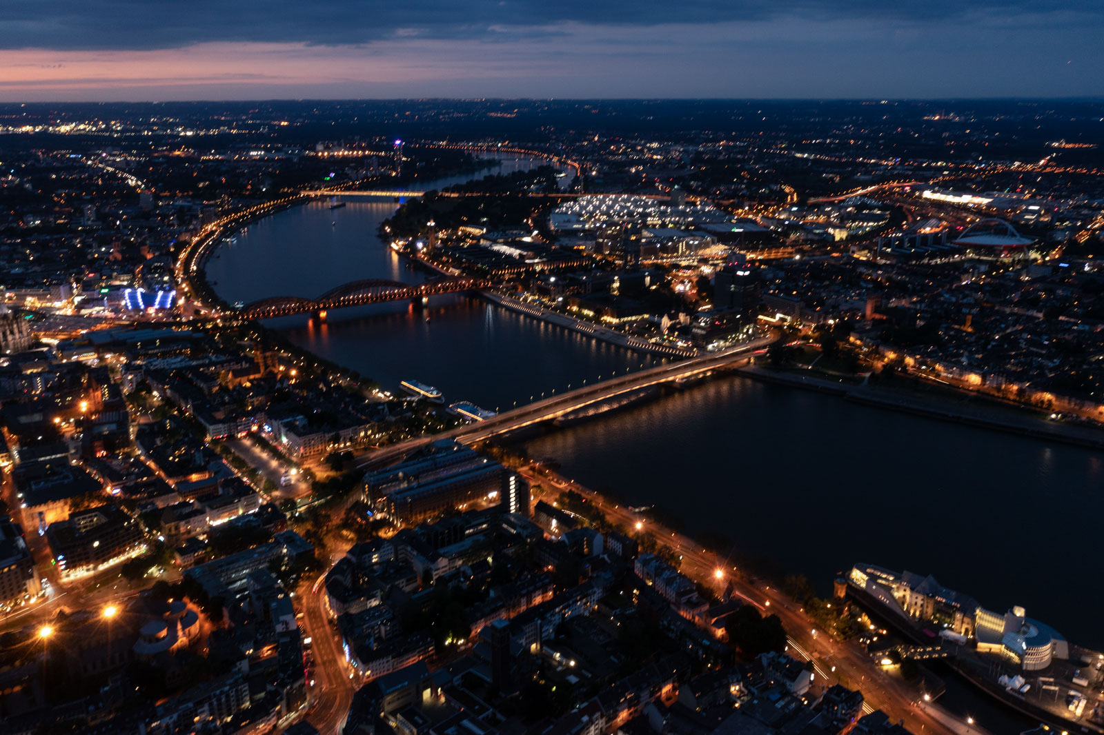 dieses und das nächste foto entstanden bei meinem ersten nachtflug mit der fotodrohne über köln. auslöser ist die anfang 2021 in kraft getretene EU-drohnenverordnung, die mehrere auflagen mit sich bringt, aber eben auch den zuvor nicht erlaubten nachtflug ermöglicht. in diesem fall mit drohnenführerschein A2, ausnahmegenehmigungen der luftfahrtbehörde der NRW landesregierung und absprache mit der deutschen flugsicherung im tower von köln/bonn. letzteres deswegen, weil die am aufstiegsort in der kölner südstadt maximal erlaubte höhe 50 m ist, ich aber durch erfahrung am tag weiß, dass erst 200 meter höhe einen überblick über die stadt ermöglichen. hier war ich 270 meter hoch.