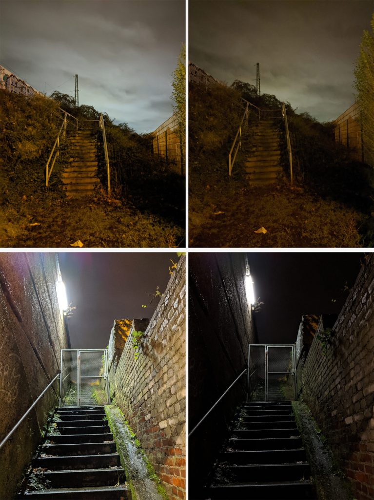 last night, walking home from the tram, two closed stairways to … the rail tracks. all four photos taken with a single lens, 3 year old smartphone. the left images with, the right images without night mode. of course, the original resolution is much higher. the two photos on the right were taken with a manual exposure adjustment: all the way down. the top right image reminds me of romantic landscape paintings in the early 19th century.