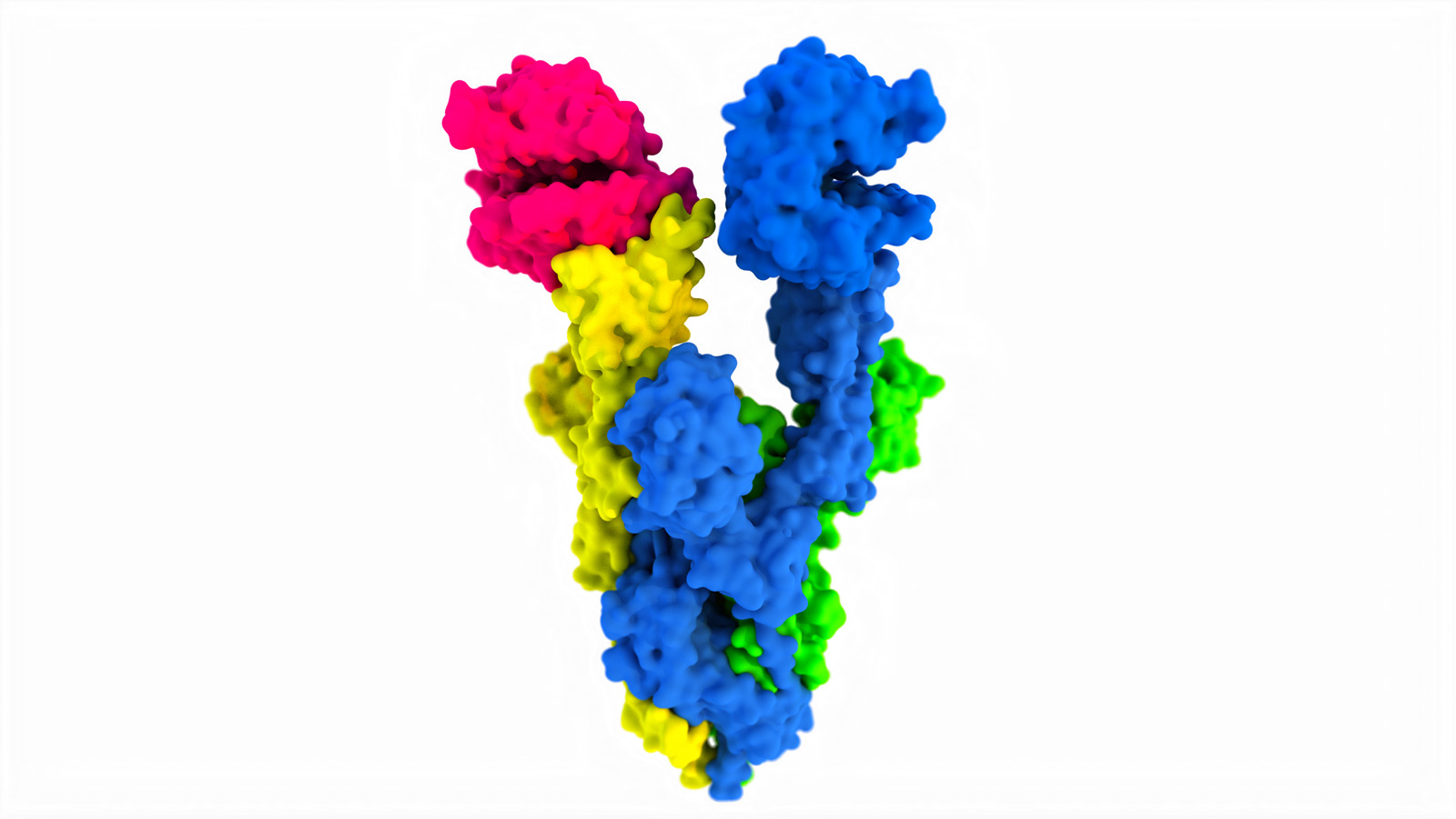keep in mind: in atomic dimensions colours don’t make sense. we can only derive structures from electron microscopy and try to visualize them. the first image shows the five protein units of the SARS-CoV-2 omicron spike in distinct colours. the second rendering is less abstract, but, of course, not realistic either. all images can be licensed via picturealliance/dpa.