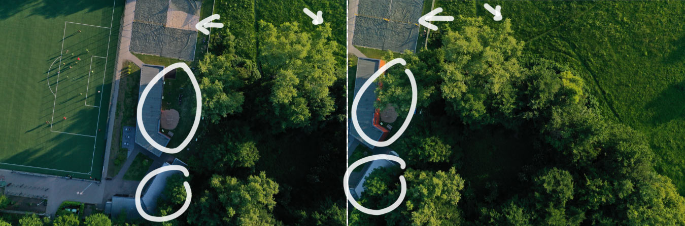 i’m familiar with drone photography, but not with aerial encounters which involve a lot of postprocessing, especially stitching of several images. the photo below was stitched together from 8 single, overlapping orthogonal drone shots and is almost perfect: