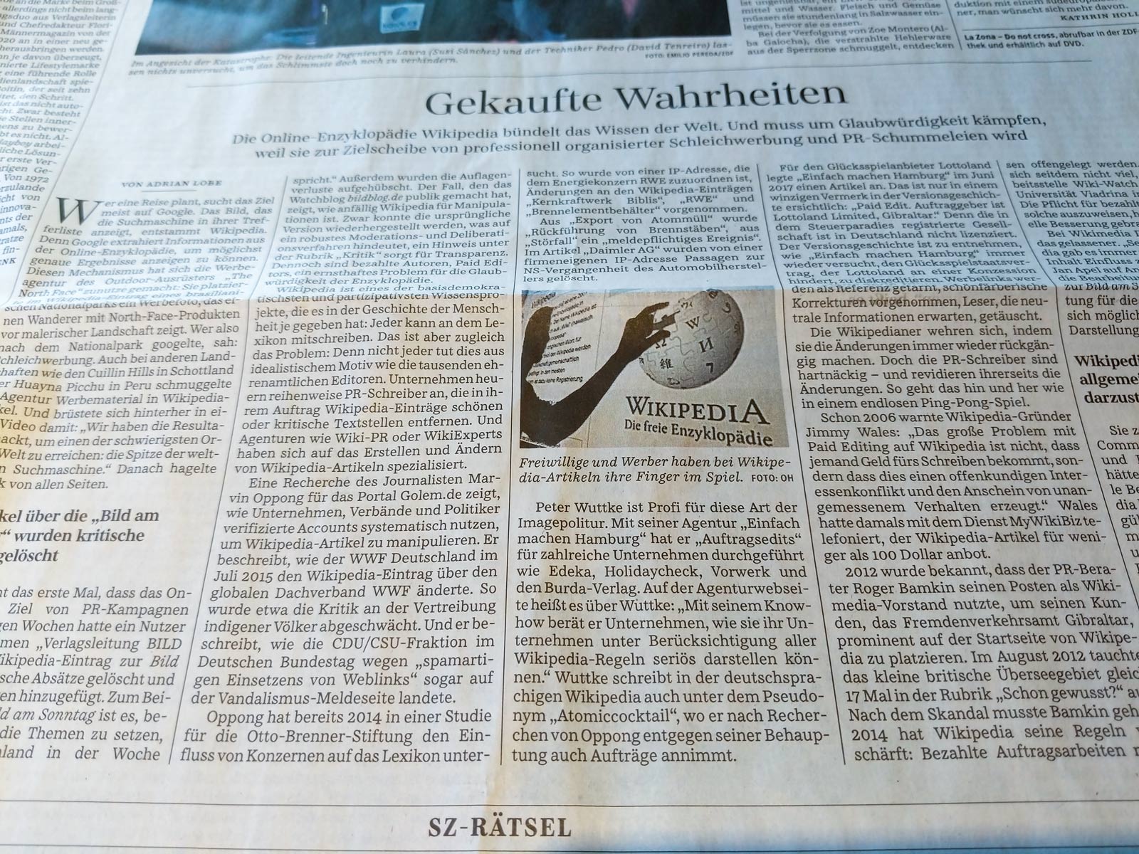 heute berichten die feuilletons, auch wenn man das nicht über einen kamm scheren muss, mit tiefem respekt und teilweise sehr präzisen kritikpunkten. adrian lobe, freier journalist, etwa. die süddeutsche zeitung druckte einen langen artikel von ihm ab, der → „gekaufte wahrheiten“ betitelt war. neben dem heute üblichen general-lob geht adrian lobe auf das problem des bezahlten schreibens in der wikipedia ein. das problem ist alt und wurde vor etwa 5 jahren so virulent, dass innerhalb der wikipedia arbeitsgruppen entstanden, die sich damit beschäftigten, ob man bezahltes schreiben zulassen oder autorInnen, die bezahlt schreiben, sperren sollte.