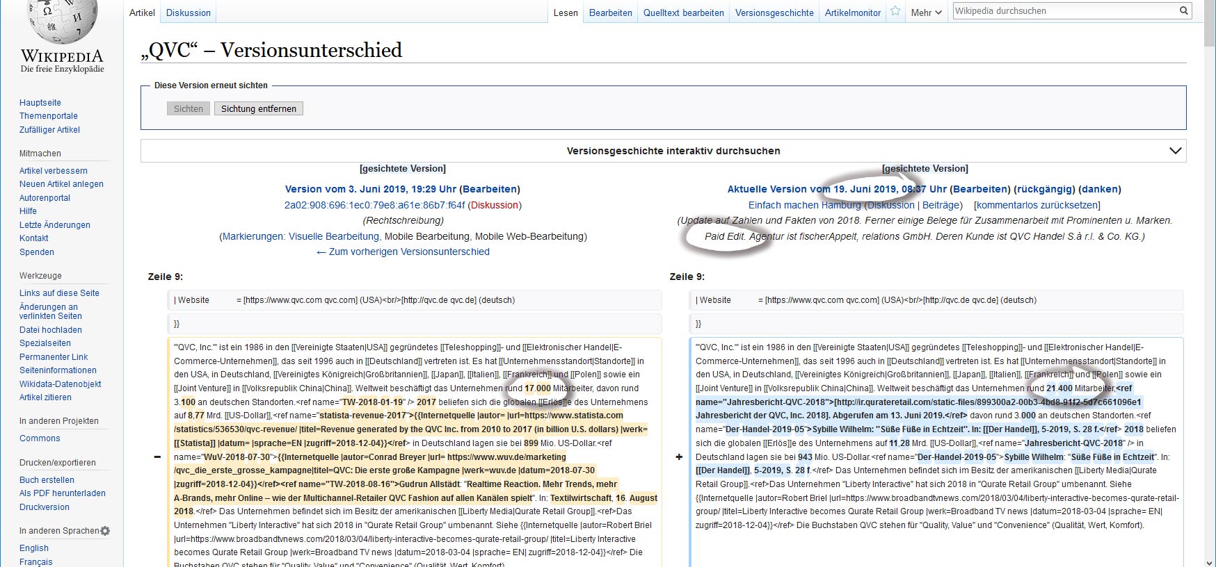 kollege adrian lobe kocht in seinem artikel einen alten fall auf, der sich um den ur-wikipedianer namens → atomiccocktail dreht. peter wuttke, wie er mit klarnamen heißt, lebt vom „coaching“ von firmen; wenn er das gegen bezahlung in der wikipedia tut, geschieht das unter dem verifizierten account einfach machen Hamburg. dort findet sich als letzter edit der artikel über den selbstverständlich abscheulichen fernsehdauerwerbekanal QVC, wo wuttke neue zahlen einflocht und dabei transparent macht, dass er an diesem eintrag monitär beteiligt war: