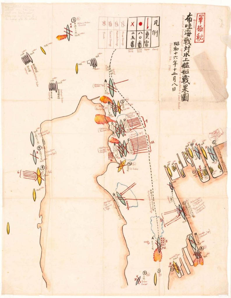 die grafik zeigt eine dem japanischen kaiser vorgelegte karte nach dem überfall auf pearl harbor. die amerikanischen schiffe wurden alle getroffen; auf der karte sind auch die einsätze welcher munition aus welcher richtung verzeichnet. → das dokument befindet sich im archiv der library of congress.