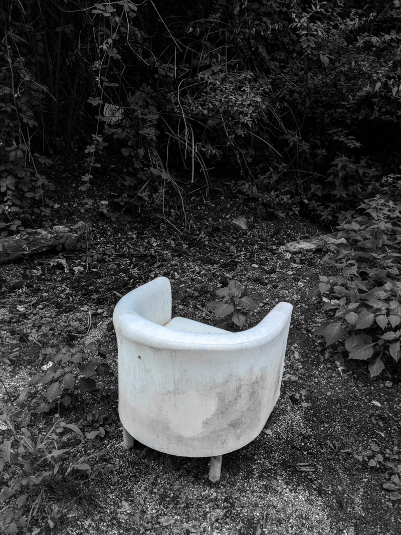 dieses foto entstand bei einem spaziergang im äußeren grüngürtel von köln. ich habe es in photoshop minimal bearbeitet, nämlich die überbordenden grüntöne der blätter auf schwarzweiß gesetzt, den sessel aber so gelassen, wie er ist. weil mir die blickrichtung nach links nicht gefiel, horizontale spiegelung, fertig.
